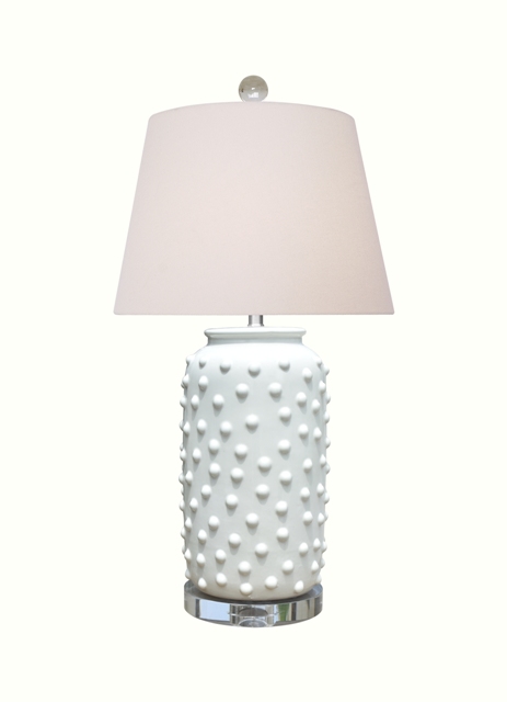 Dotted White Porcelain with Solid Crystal Base, Nickel Parts and Matching Finial, 28″ High and 18″ Wide White Linen British Empire Shade with Rolled Edge (no trim). Three Way Socket, Maximum 150W, UL Listed.